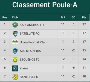 Jamais Karfamoriah FC de Kankan n’a été aussi proche de l’élite du football guinéen. Après son match nul (1-1) ce samedi contre l’Union FC, le club prend la tête du classement du groupe A avec 17 points, à égalité avec Satellite FC et son adversaire du jour. Karfamoriah occupe la première place grâce à une meilleure différence de buts.